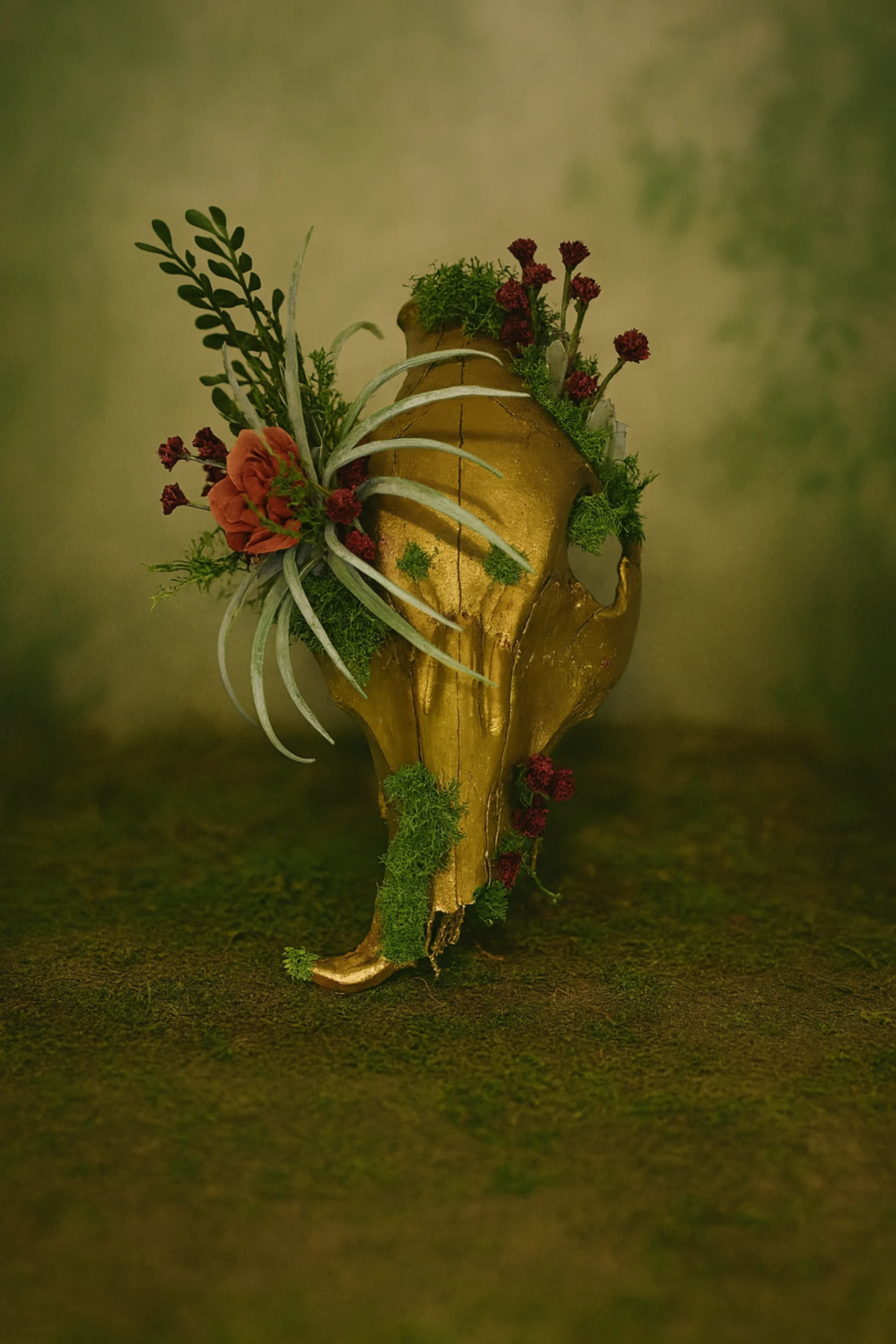 One-of-a-kind golden-painted deer skull with moss, preserved florals, and quartz crystal accents.