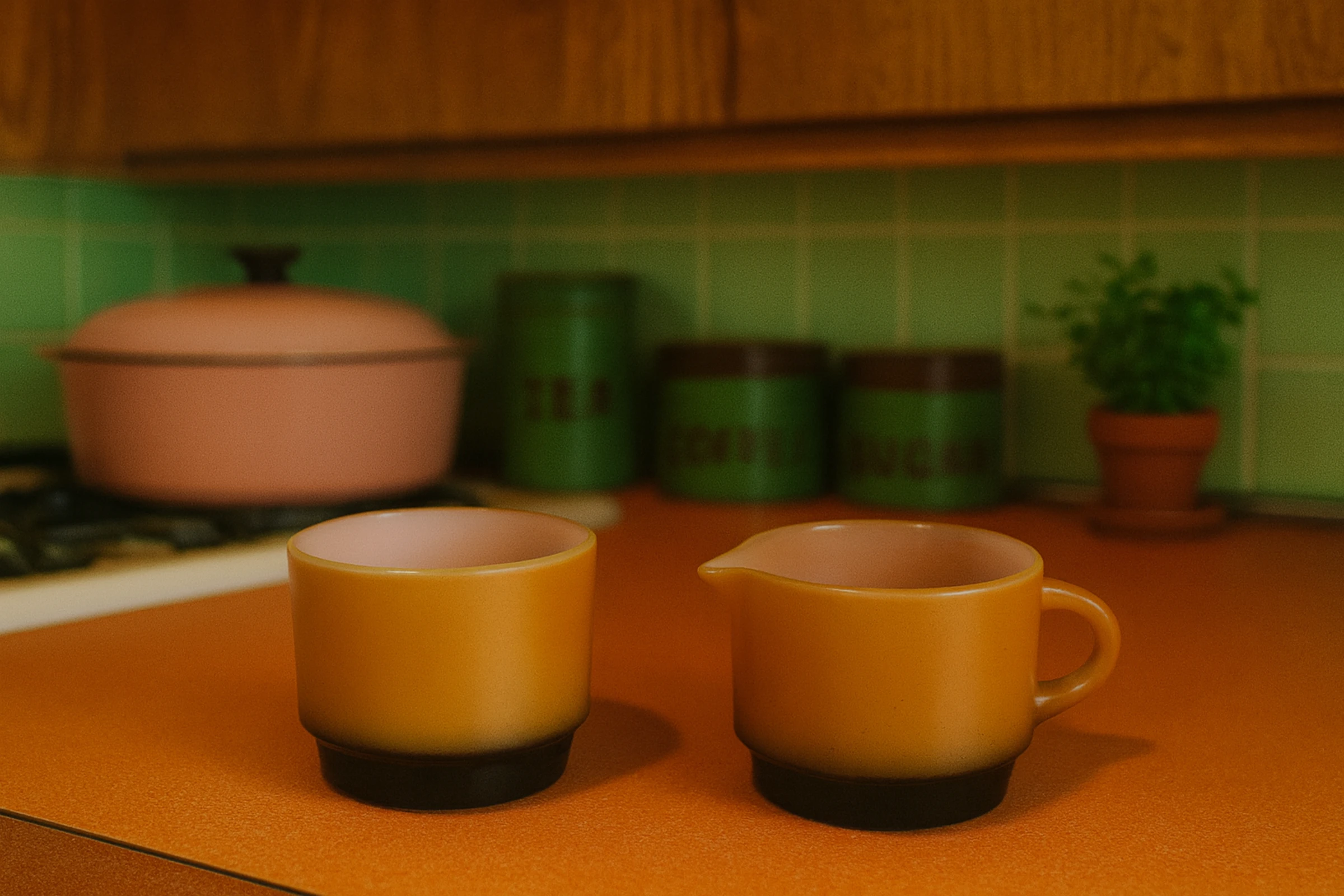 Be the first to review “Vintage Fire-King Honey Gold Ombre Coffee Set – 4 Mugs + Creamer & Sugar”