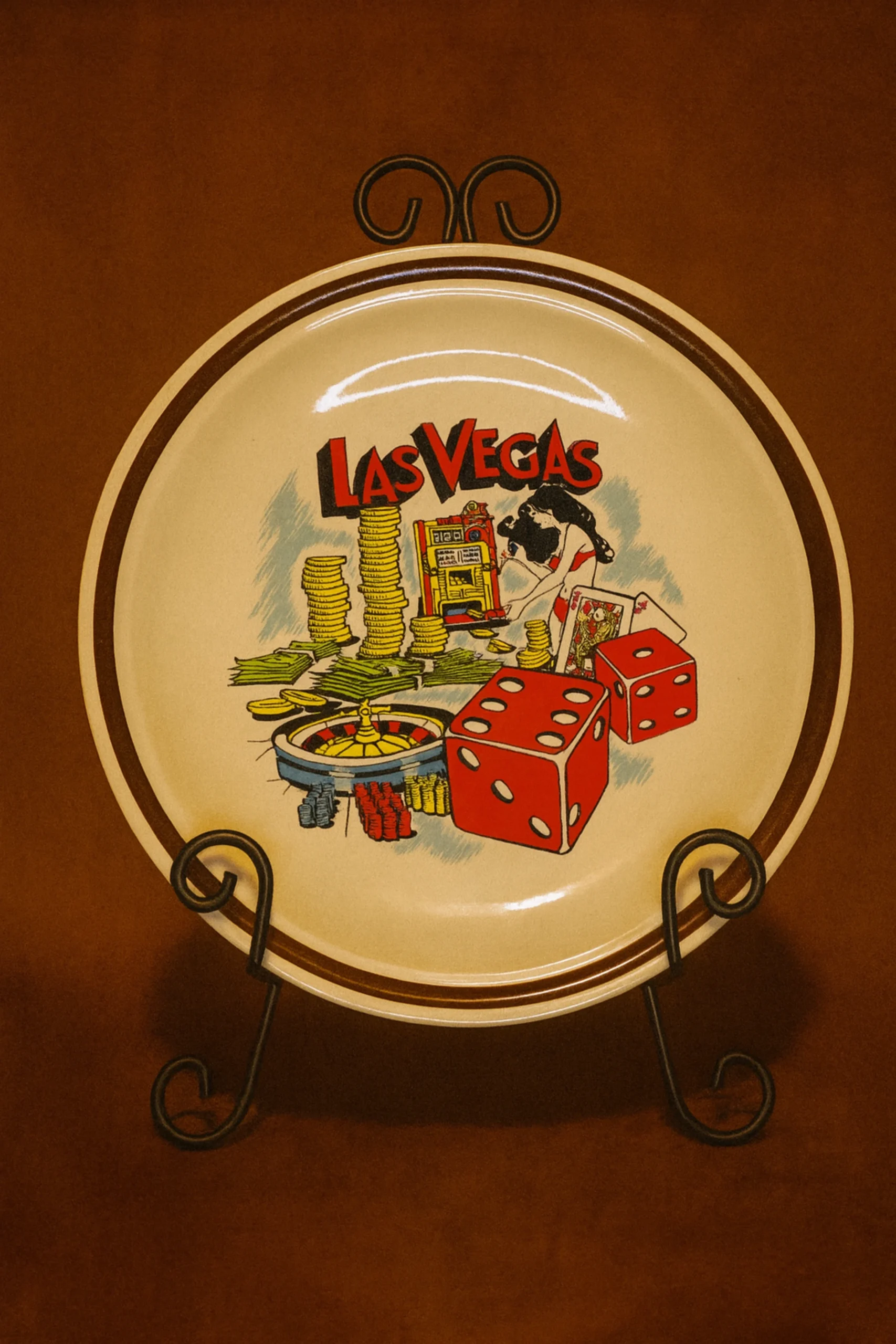 Retro Vegas souvenir ceramic plate with dice, roulette, cards, and pin-up art.